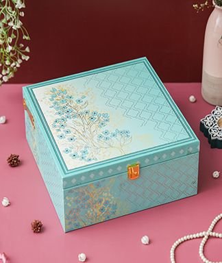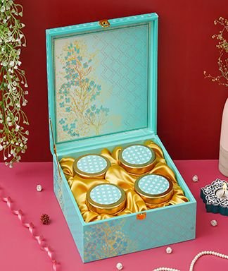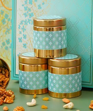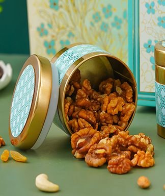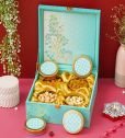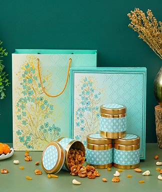 | Name | Diwali Dry Fruit Hamper | Blue Tree Pattern With 4 Matching TIN Jar |