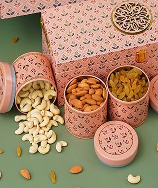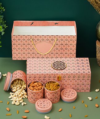 | Name | Diwali Dry Fruit Hamper | Elegant Pink Pattern With 3 Matching TIN Jar |