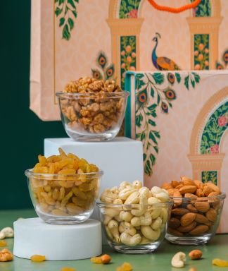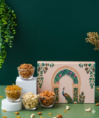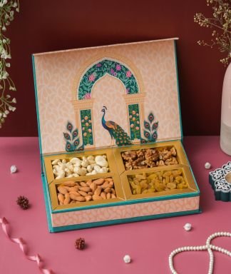 | Name | Diwali Dry Fruit Hamper | Eye-Catching Peacock Artwork Design With 4 Partitioned Sections |