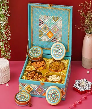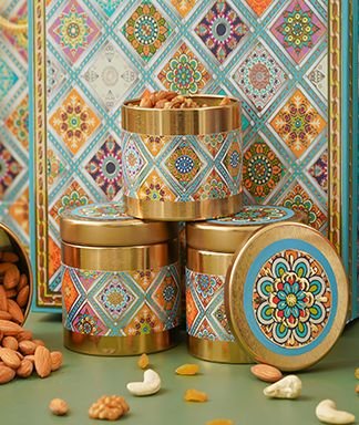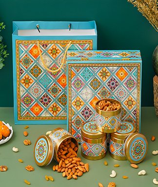 | Name | Diwali Dry Fruit Hamper |Rajasthani Texture Pattern With 4 Matching TIN Jar |