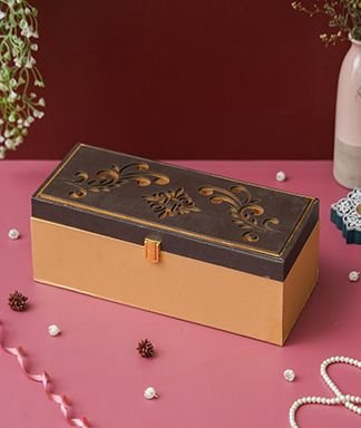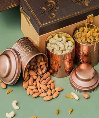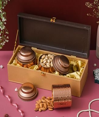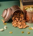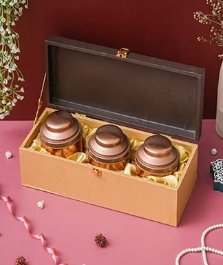 | Name | Diwali Dry Fruit Hamper | Warm Brown Wooden Box With 3 Matching TIN Dome Jar |